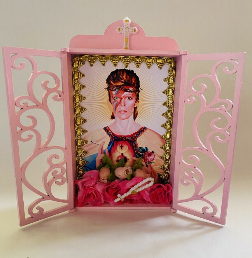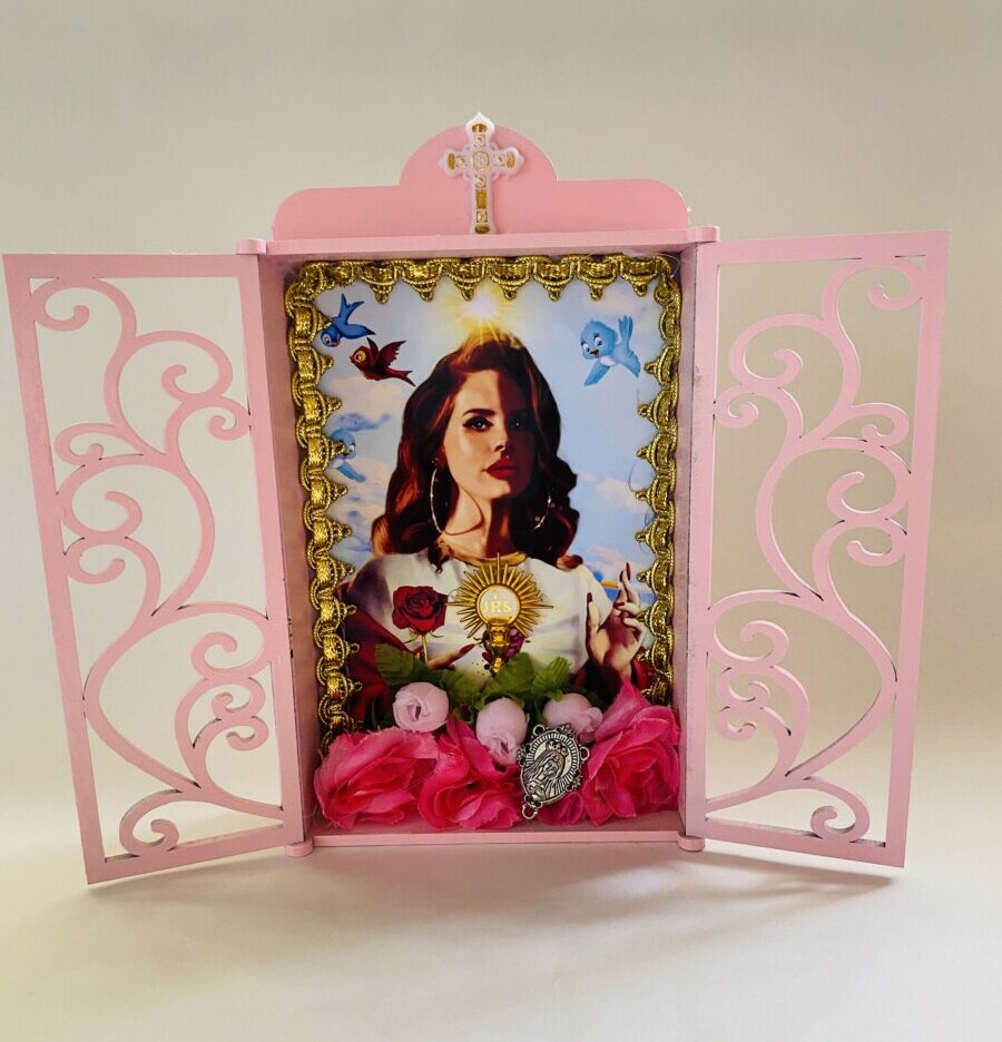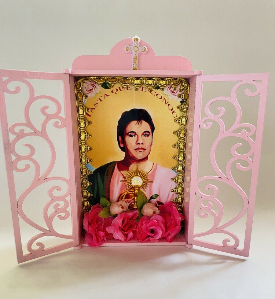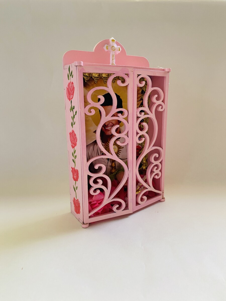 Hermoso Altar pintado a mano y decorado con objetos católicos y flores, mide 20 cm de alto por 23 cm de ancho con sus puertas abiertas