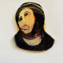 • Pieza unica de ceramica, pintada dorada, modelada a mano, viene con marco incluido para colgar, mide 16x16 cm en total